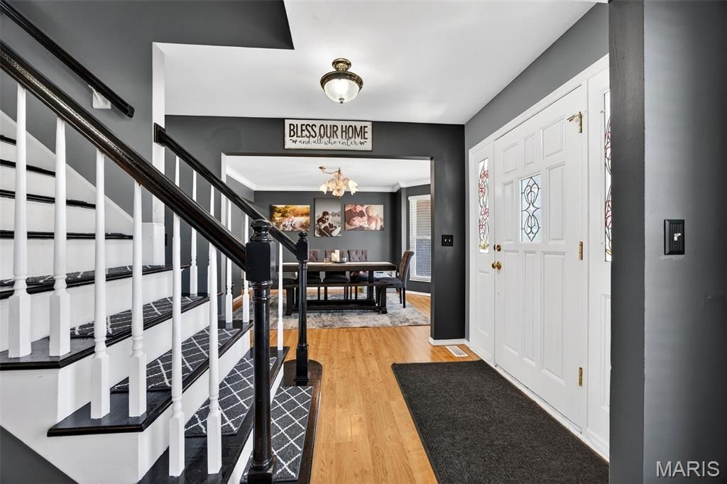 Welcome to 1 Belcourt Circle, tucked into a quiet cul-de-sac on a corner lot in the Wellington Farm subdivision. This is the kind of neighborhood buyers are gravitating toward right now, established with mature trees, lakes, and a little more breathing room between homes.This 4 bedroom, 2 story home offers a layout that just works. The kitchen features granite countertops, a center island, wraparound counters, and a stone backsplash, all opening into the great room with a wood burning fireplace and bay window for great natural light.Upstairs, the primary bedroom includes crown molding and a bathroom with double sinks, custom tile floor and surround, separate tub and shower, and a skylight. The hall bath also features tile flooring and a full tile surround. You'll find vinyl windows, six-panel doors, and faux wood blinds throughout.The walkout basement is partially finished with two large living areas, a half bath, and plenty of storage, giving you flexibility for additional living space, a rec room, or a work-from-home setup. Out back, there's a fenced yard with both a patio and a deck, offering multiple outdoor spaces and easy access from the home.Location is another big plus, just minutes from Hwy 94 and 364, and under 10 minutes to Cottleville with restaurants, shops, and entertainment. All within the Francis Howell School District. If you've been looking for something in a well-established neighborhood with more space, mature trees, a great location, and top-rated schools, you won't want to miss this.